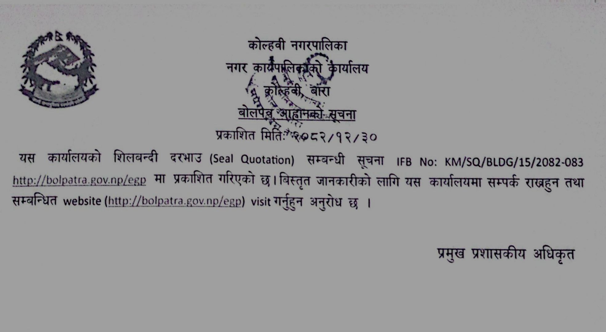बोलपत्र (Seal Quotation) सम्बन्धि सूचना IFB No: KM/SQ/WORKS/14/2082-083