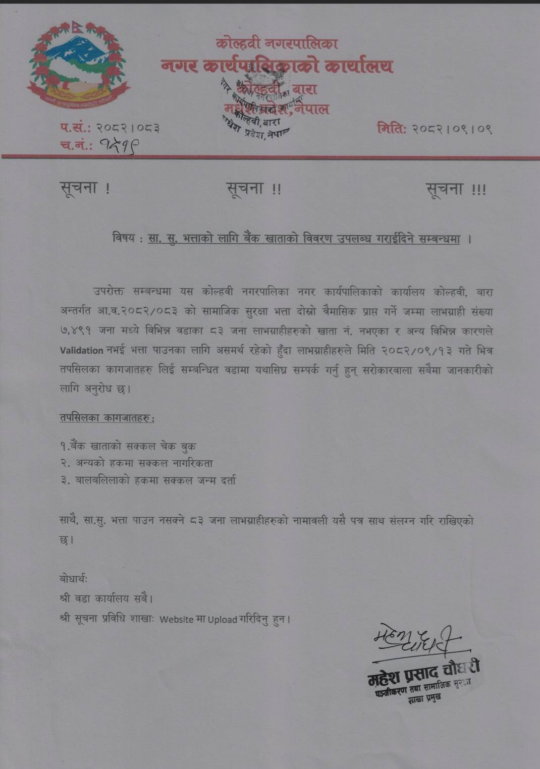 सा.सु. भत्ताको लागि बैंकको विवरण उपलब्ध गराइदिने सम्बन्धमा।