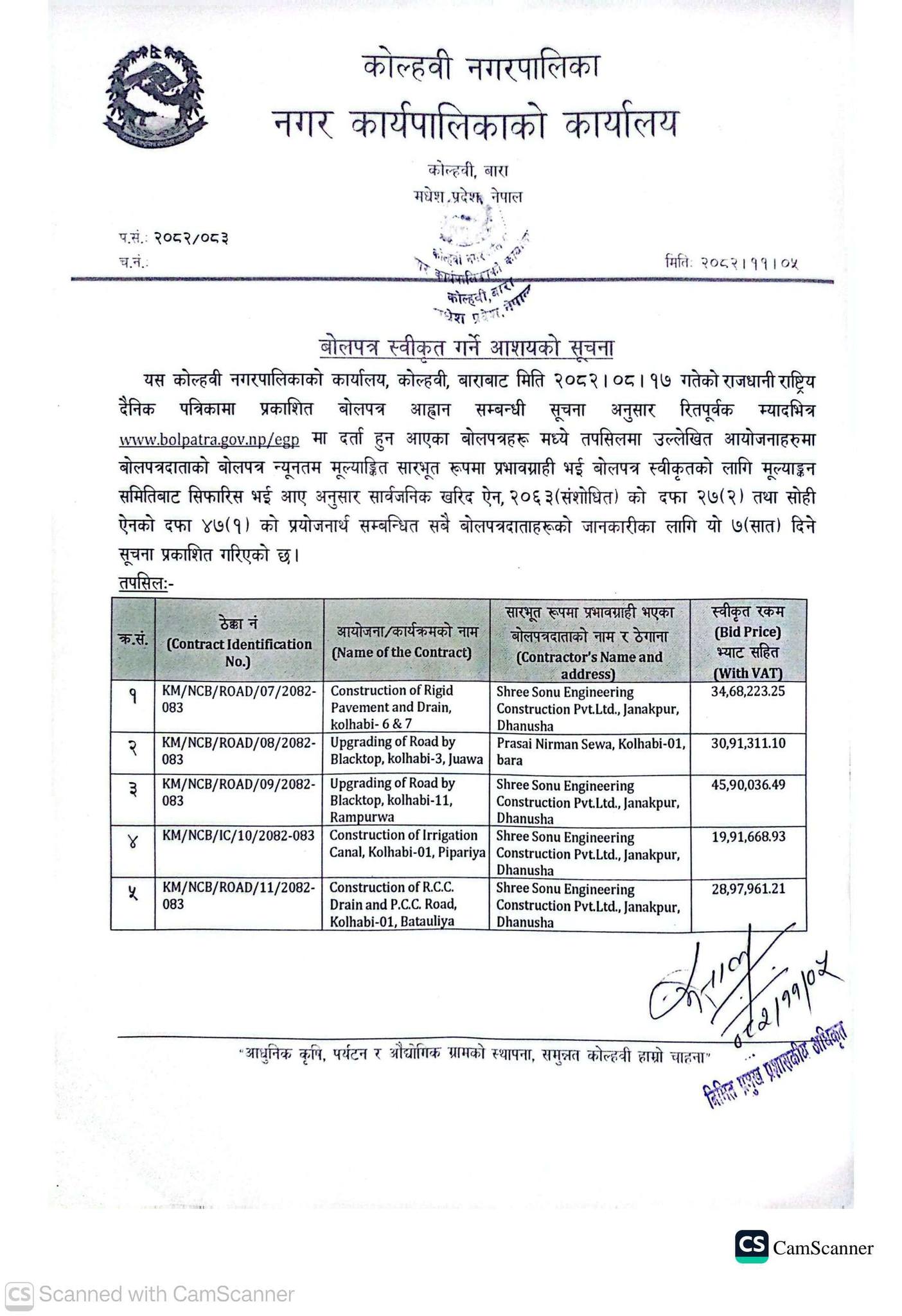 बोलपत्र स्वीकृत गर्ने आशयको सूचना